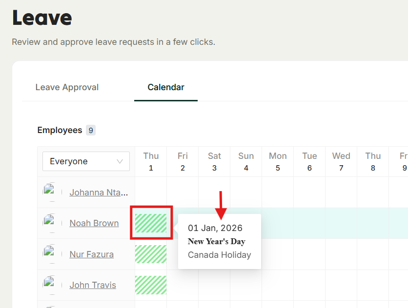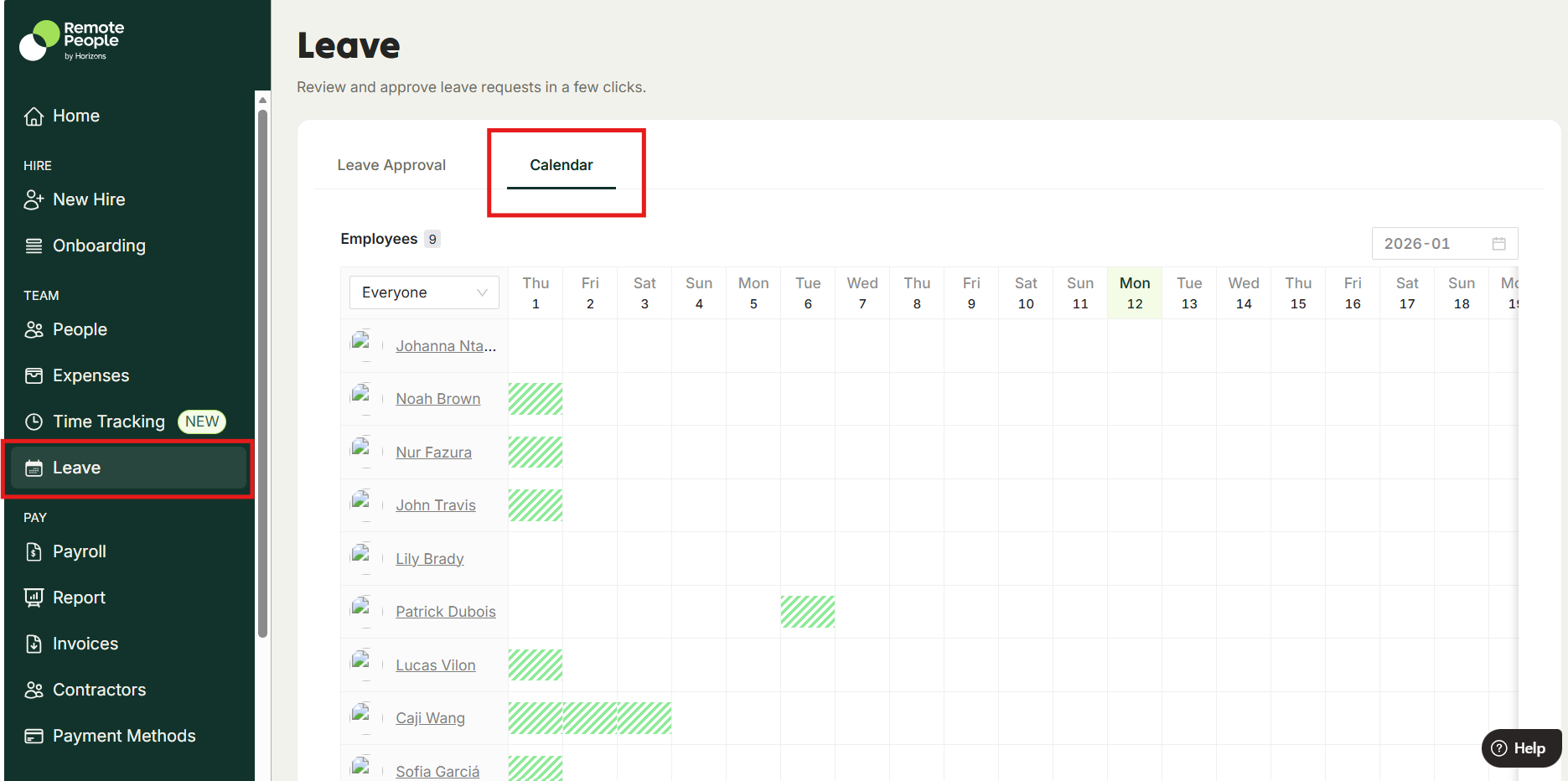 In the People tab, on the left navigation panel, click on Calendar tab to see each team member's leave status in team calendar. Both public holidays and leave days are clearly marked.