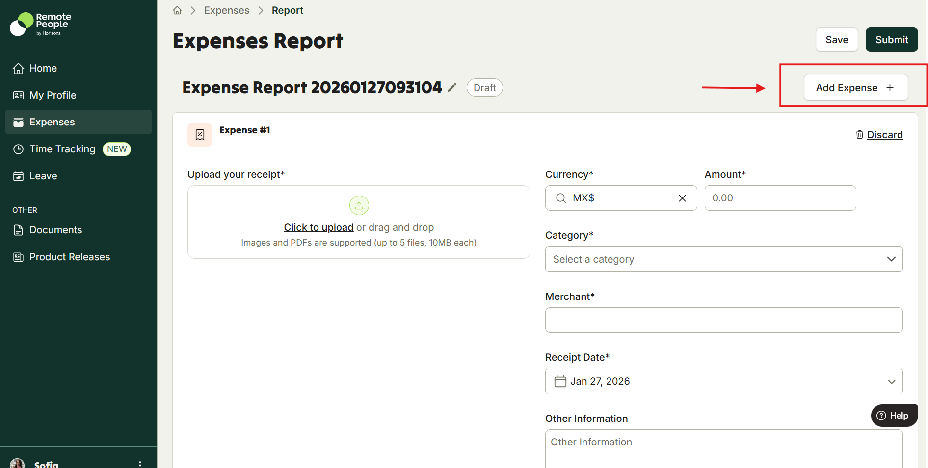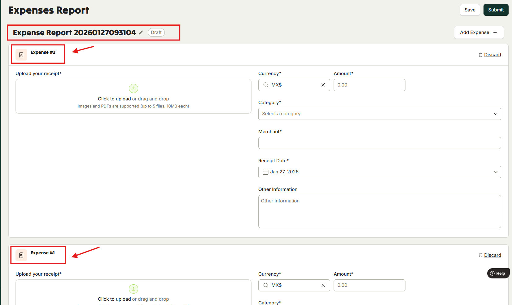 - Fill in your expense details, ensure you select the right currency and category from the drop down menu, and upload receipts.