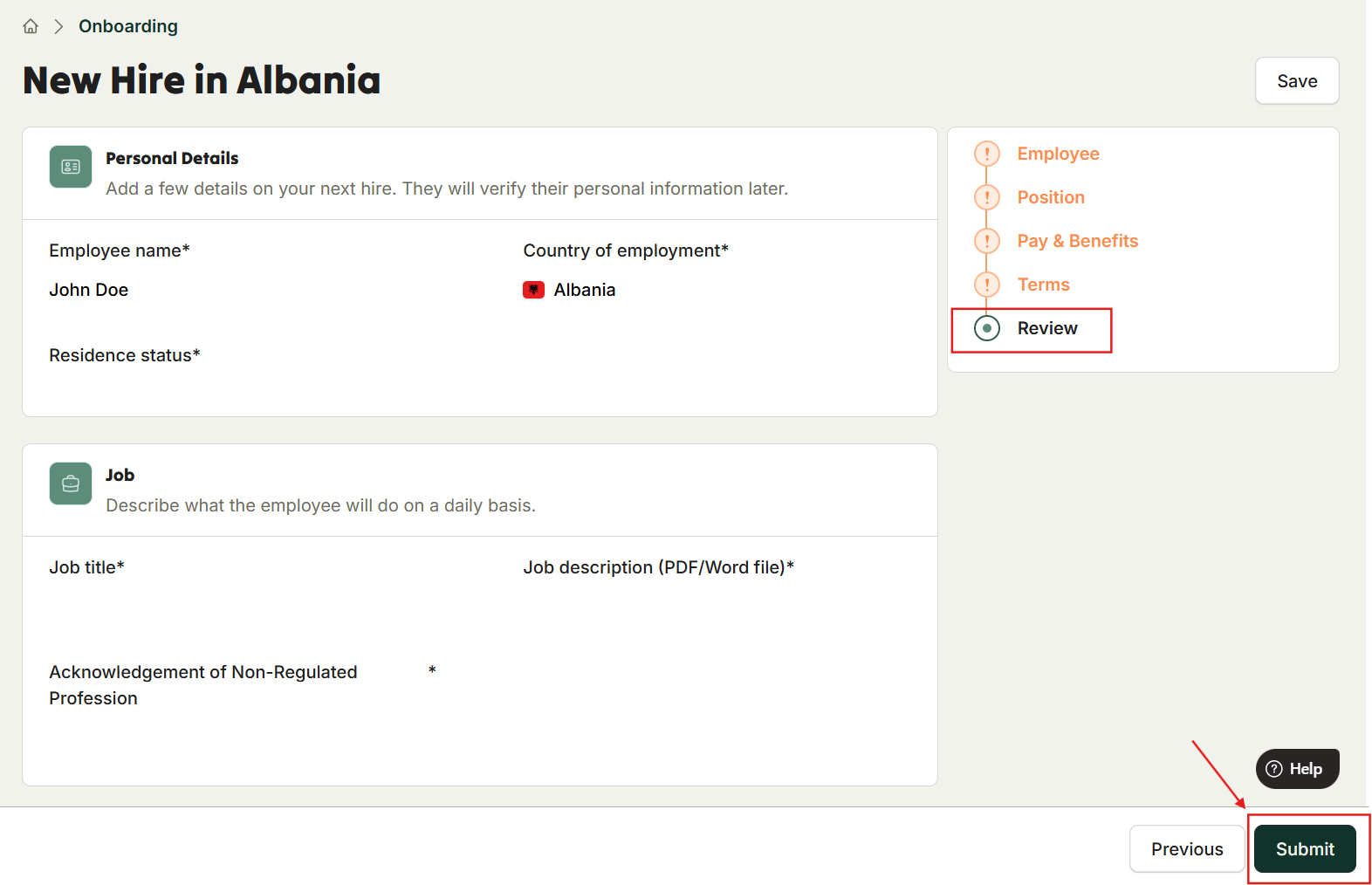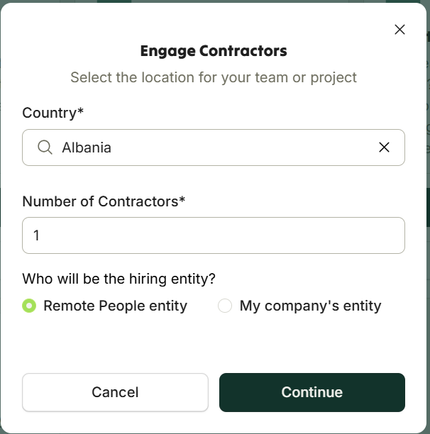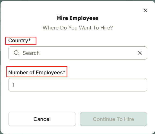 Choose the country where the hire will be located.