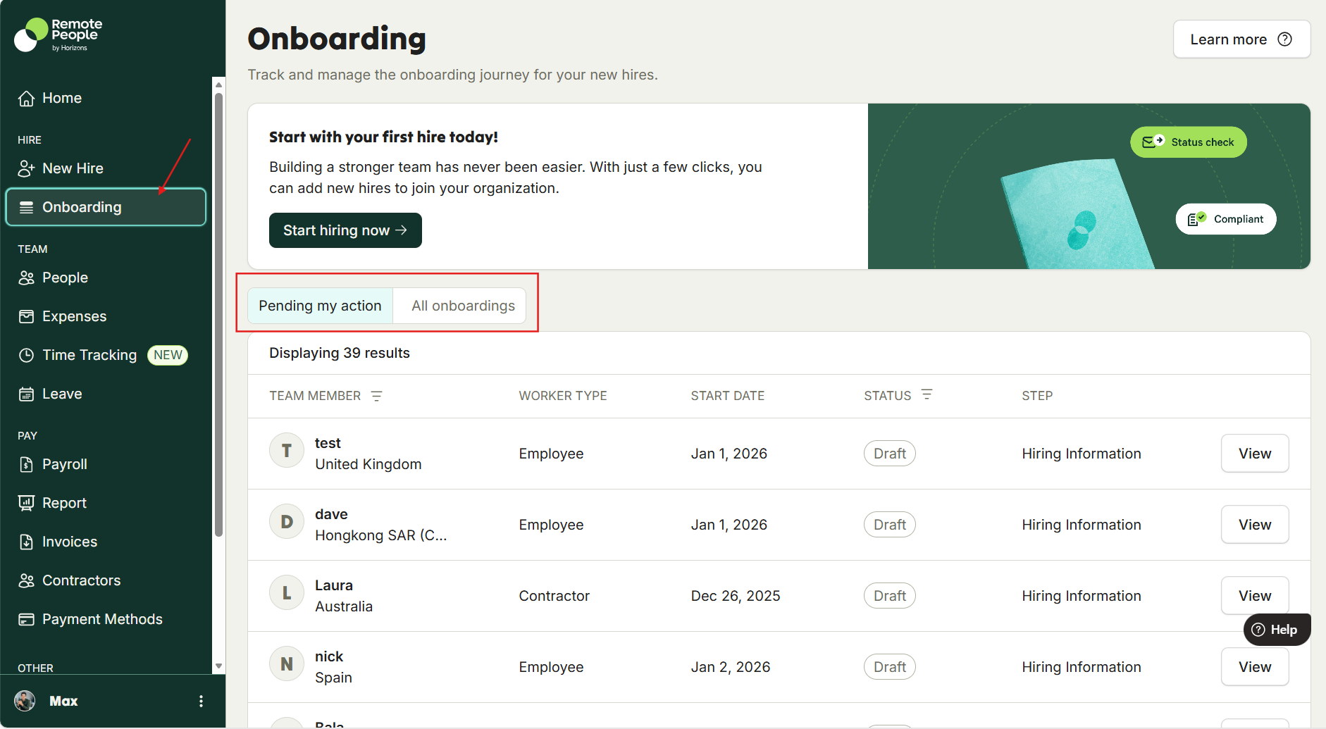 The Onboarding Overview Page provides an easy way to monitor the status of all ongoing onboardings for both full-time employees and contractors.